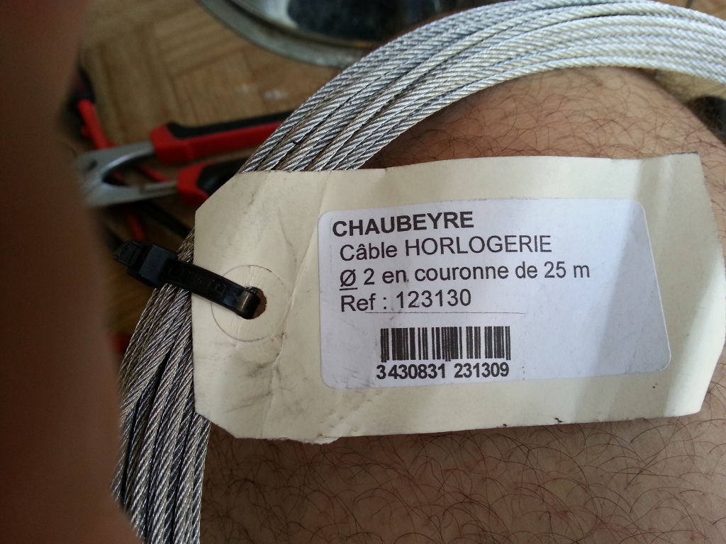 Perso, comme le câble d'horlogerie que j'ai acheté fait 2mm j'étais juste, une fois coupé, pour rentrer dans les serres câbles j'ai donc légèrement agrandi le perçage. (forêt métal de 2,5 mm)