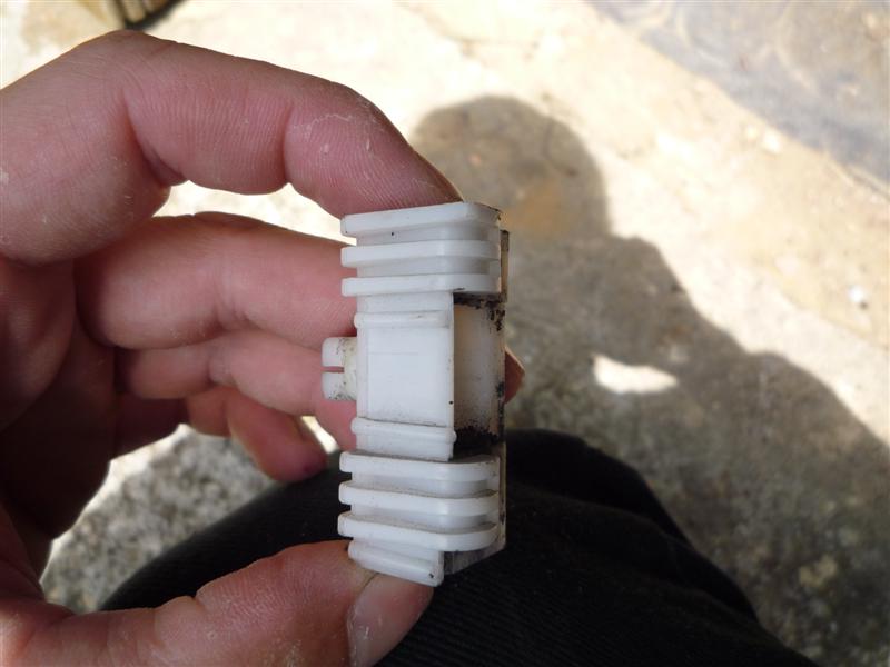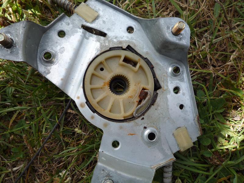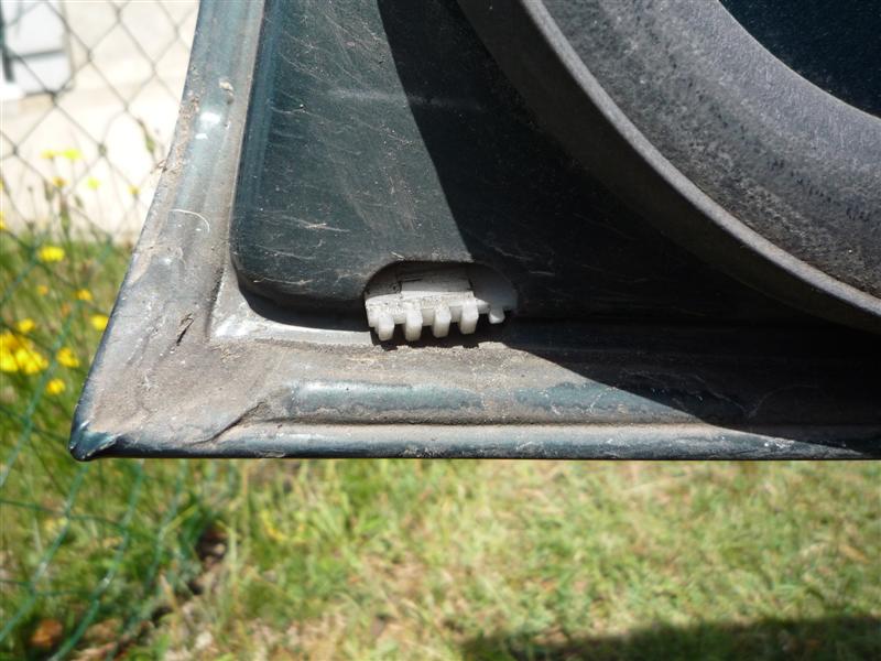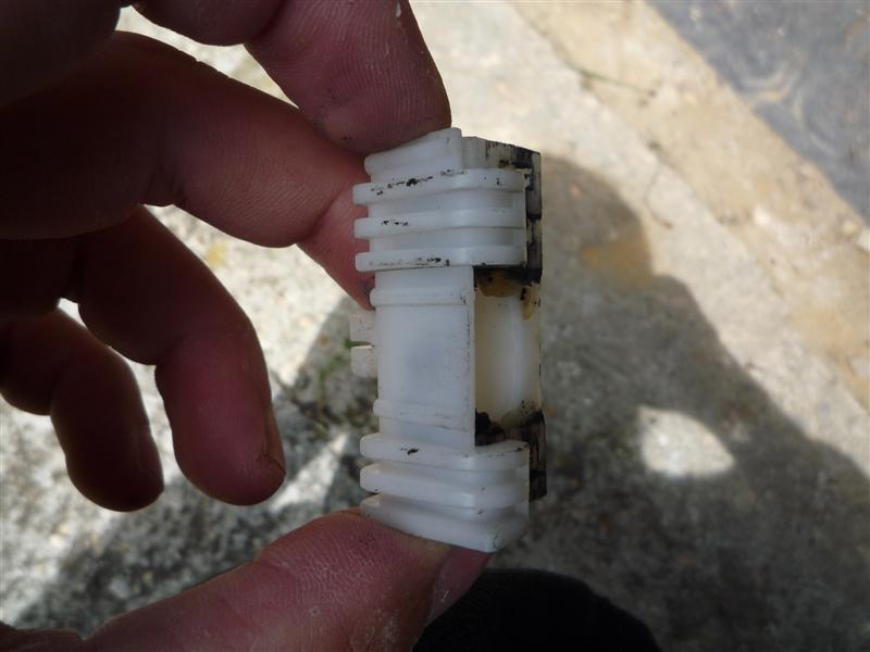 Etape 2 : le guide plastiquealors la pièce qui casse, guide en plastique sur lequel la vitre est fixée et qui coulisse dans le rail accroché par les 2 cables.