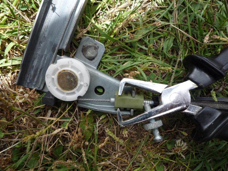 Maintenant, le grand moment, l'enroulage du câble. Suivez le guide. Avant toute chose: si vos câbles ont pris des mauvais plis, détordez les du mieux que vous pouvez. A présent, tirez presque au max sur le câble "vert" et enroulez-le sur la partie externe de la poulie. Photo: