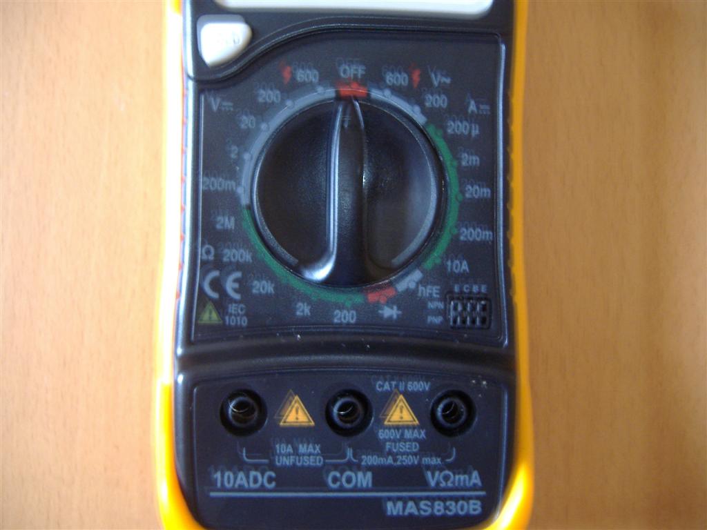 Multimètre de gauche, les pointes de touches sont "en l'air" donc pas de contact entre elles, l'afficheur clignote entre 0 et 40,00 M ce qui veut dire 40 Mégohms qui, sur cet appareil, signifie résistance infinie