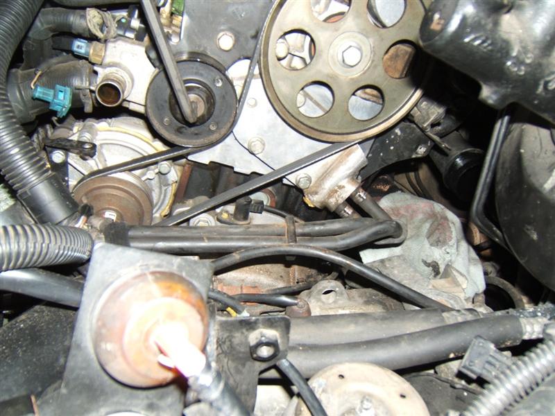 Ce tendeur est caché sur la photo par ma clé mâle en position. . Repérer le passage de la courroie dans les gorges striées de la pompe à eau, car la courroie n'a que 3 stries. Sinon bien vérifier le meilleur alignement possible.