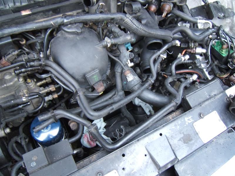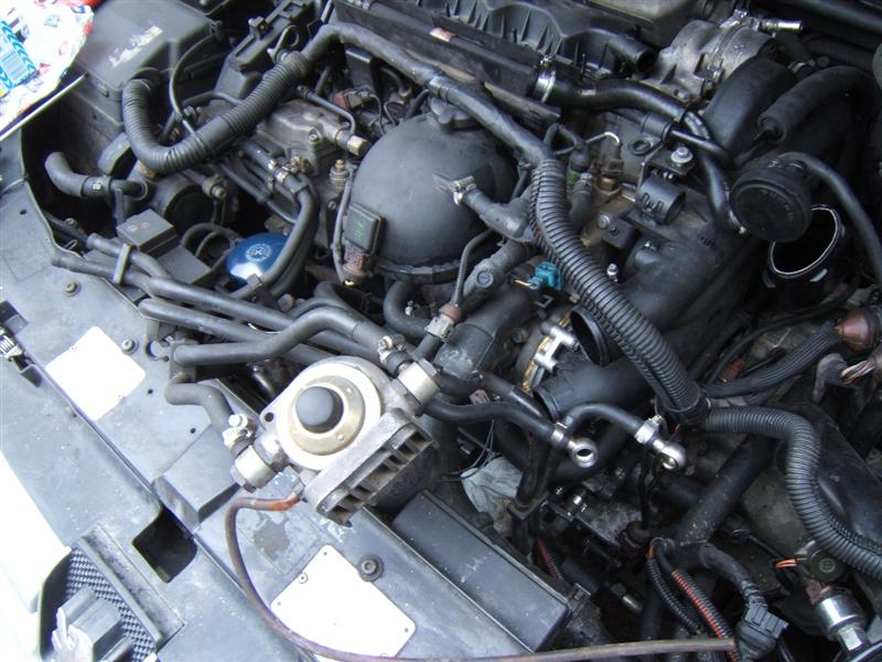On voit la durite d'air en plastique rigide partant vers le turbo qu'il faut maintenant retirer (2 vis de 10 avec rondelles épaulées en sus des serflex ); et le carter de la courroie de pompe à eau, dans lesquels sont emboitées les 2 durites de chauffage.
