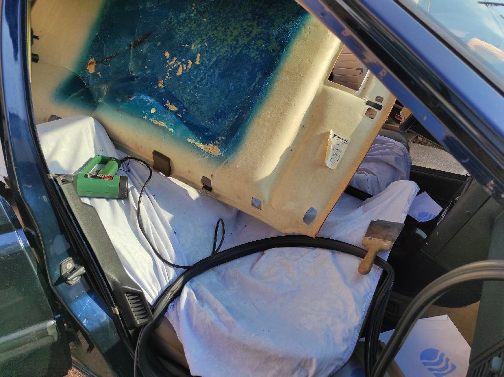J'ai enlevé tout ça hier et ce n’était pas vraiment une partie de plaisir. Il faut éviter de décoller le tissu avant de sortir le ciel de toit, au risque de voir la colle se déposer partout dans l'habitacle en petites particules goudronneuses. Le ciel de toit est composé de deux surfaces en fibre avec entre les deux, une petite épaisseur de mousse jaune. Cette mousse s'est totalement désagrégée lorsque j'ai commercé à passer la spatule pour tenté de le décoller.