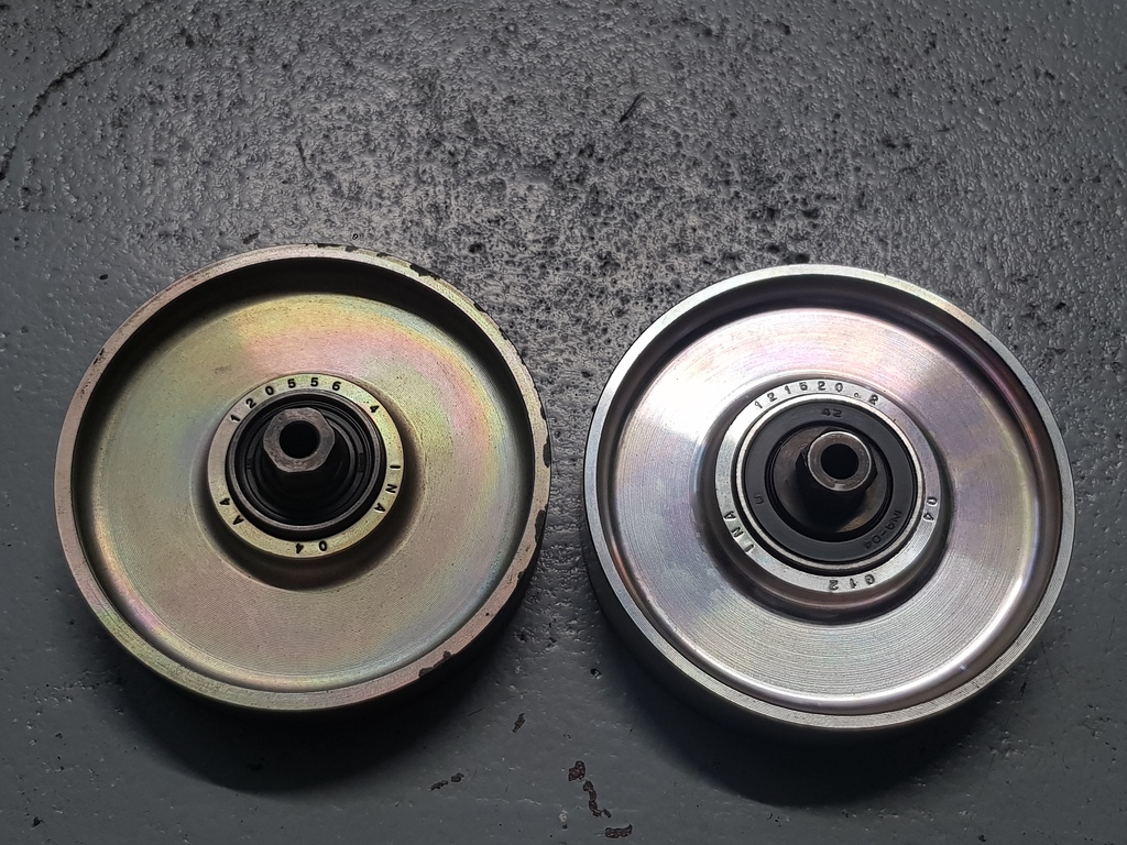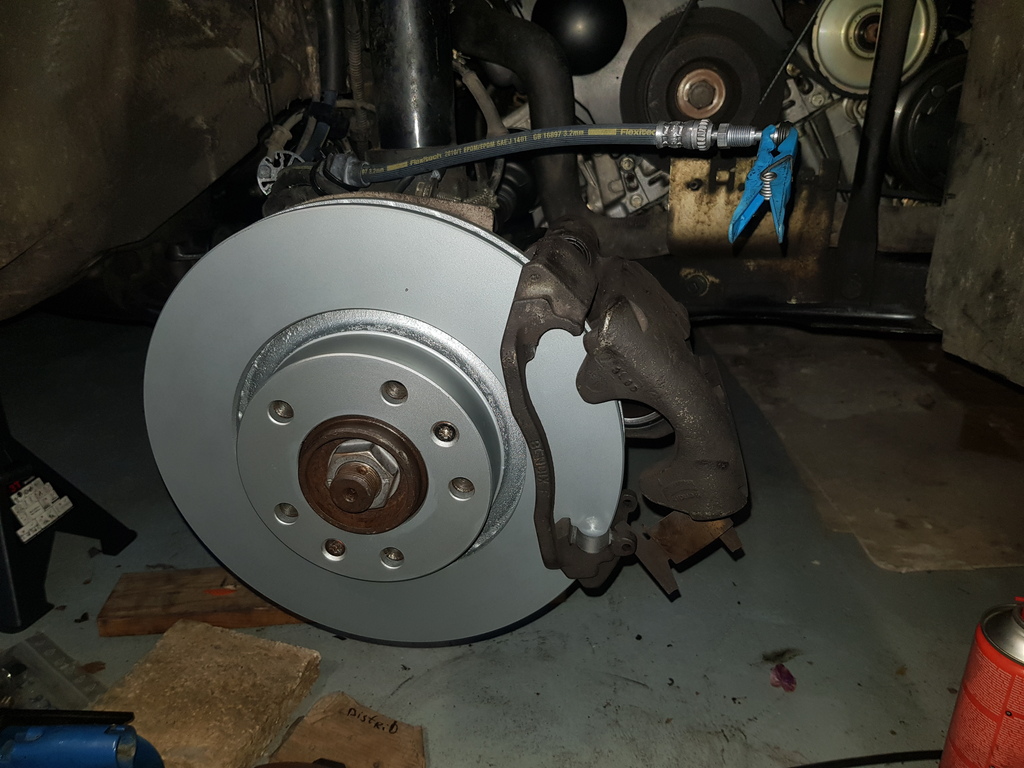 Les disques avant sont Jurid et sont revêtus. J'ai également mis des disques revêtus sur le 406 et j'en suis très satisfait. Ils résistent assez bien à la rouille. Les disques avant sont sortis (et sont entrés) sans problème, mais ceux à l'arrière ont été un véritable combat. J'ai réussi à retirer les anciens en vissant le boulon supérieur le plus épais de l'étrier pour le pousser contre le disque. Puis je lui ai donné quelques tapotements pas si doux. J'ai retiré le boulon et fait tourner le disque. J'ai répété cela environ 15 fois et ce n'est qu'à ce moment-là que je me suis détaché. Je ne voulais pas le faire trop vite pour ne pas endommager le roulement. Je pense avoir réussi, même si le roulement arrière gauche faisait un son un peu plus "sec" que celui de droite... On verra plus tard.