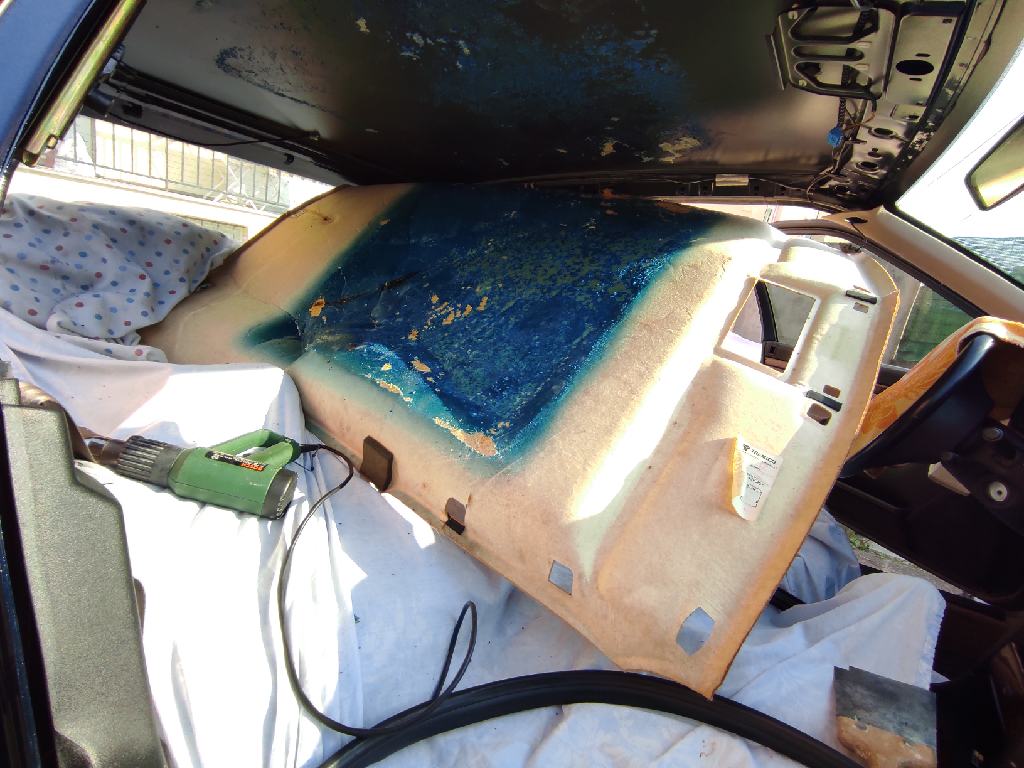 J'ai enlevé tout ça hier et ce n’était pas vraiment une partie de plaisir. Il faut éviter de décoller le tissu avant de sortir le ciel de toit, au risque de voir la colle se déposer partout dans l'habitacle en petites particules goudronneuses. Le ciel de toit est composé de deux surfaces en fibre avec entre les deux, une petite épaisseur de mousse jaune. Cette mousse s'est totalement désagrégée lorsque j'ai commercé à passer la spatule pour tenté de le décoller.