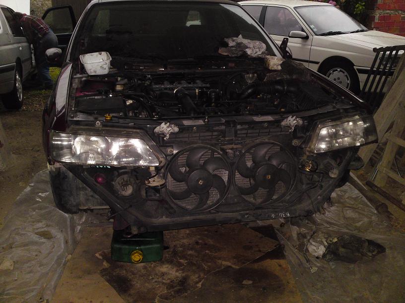 Toute la face AV est tombée, ce qui me premet de faire un peu de nettoyage au niveau des radiateu ( vive la M----e qu'il y avait). Une fois remonté, la voiture devrait mieux respirer, donc mieux refroidir.