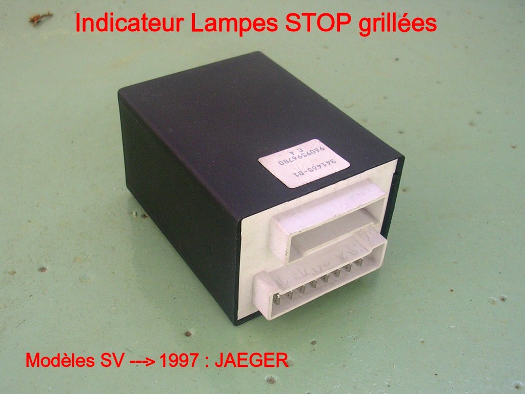 Indicateur de Lampes STOP grillées.Ce sujet traite de la fonction d'indication de défaut sur les ampoules des feus STOP des modèles SV jusqu'à 1997.Le boîtier 4440, de fabrication JAEGER, se loge sous la boîte à gants du véhicule.