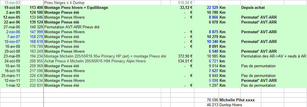 Après faut pas se leurrer, une gomme qui tient 100000 km, c'est que vous prenez les virages à 2 à l'heure, conduite hyper "coulée" avec 50 voitures au cul qui klaxonnent, des flics sympas qui ne vous diront rien sur vos pneus arrivés aux témoins d'usure, et ce ne sera possible qu'avec une gomme dure comme du béton, dans ce cas faut acheter du bas de gamme tel que du Wanli S, du Roadstone (moins pire) ou du Barum Bravuris 2 (un peu moins pire encore), vous aurez une tenue de route pourrie particulièrement sur le mouillé, mais vous pourrez aligner des 10aines de milliers de km sans problème.
