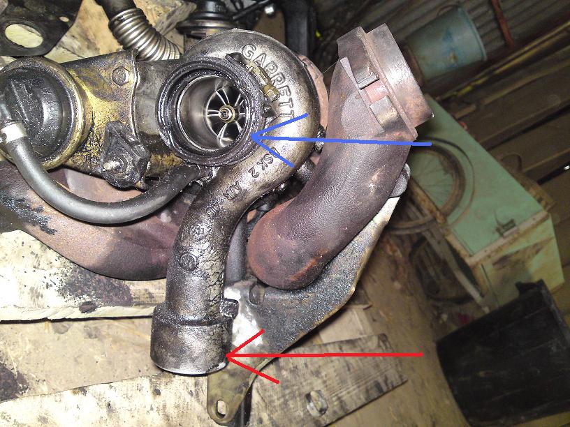 Voilà le turbo de Xantia 2,1 Td12s: la conduite qui arrive à la flèche bleue vient de la boite à air, et l'autre en rouge va vers l'échangeur air-air