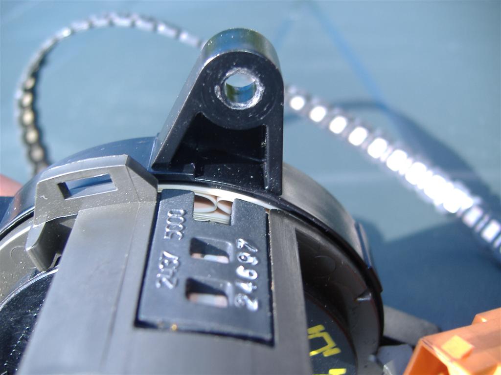 Et le bon emplacement de la petite patte plastique qui gère le point zéro, il faut bien compter le nombre de tours, pour que les repères soient en face, donc c'est très facile à faire, de toute façon, au maxi c'est 2 tours de chaque côté, et comme le volant en butée ne fait que 1 tour 1/2, il y a donc une sécurité